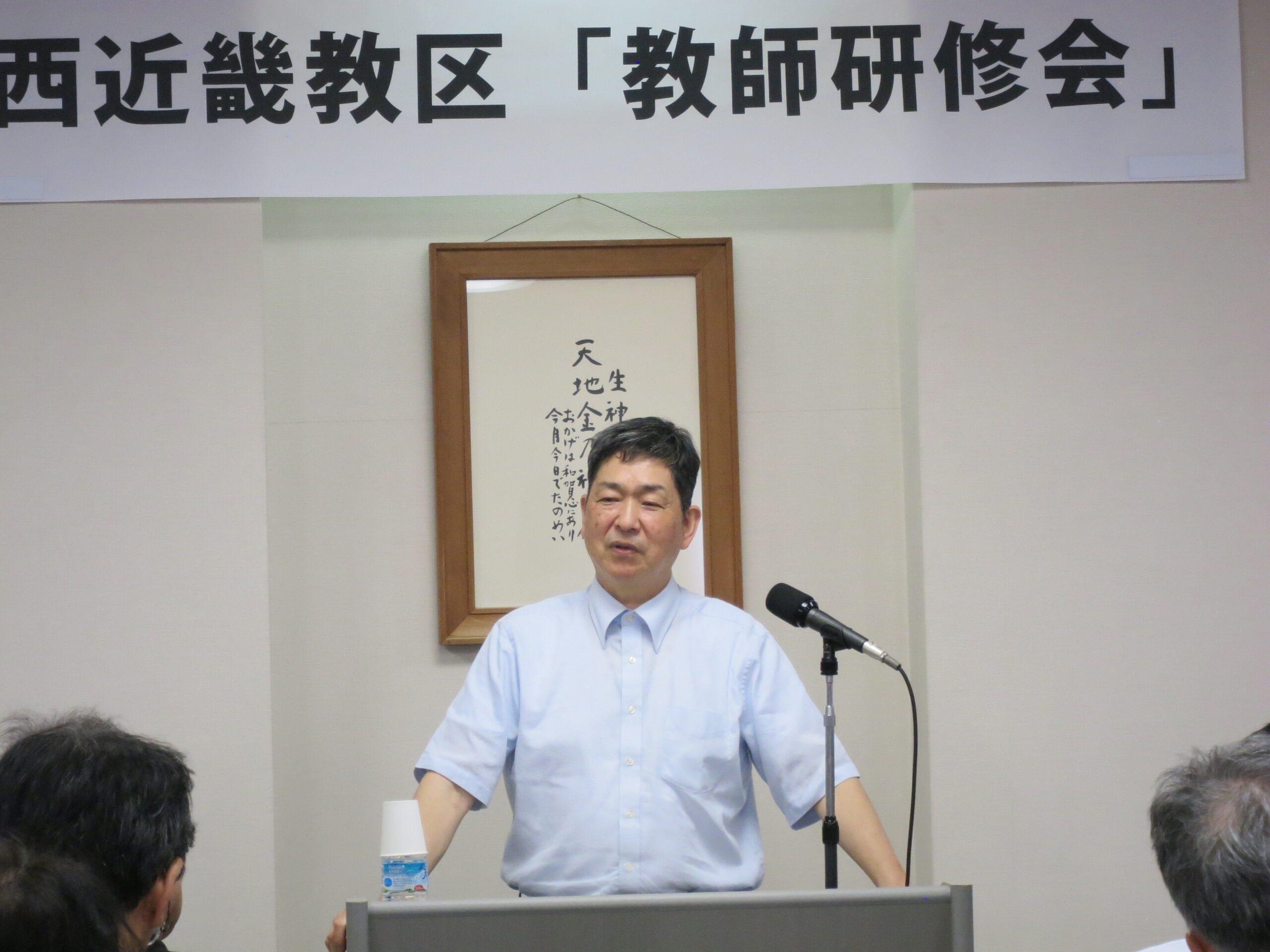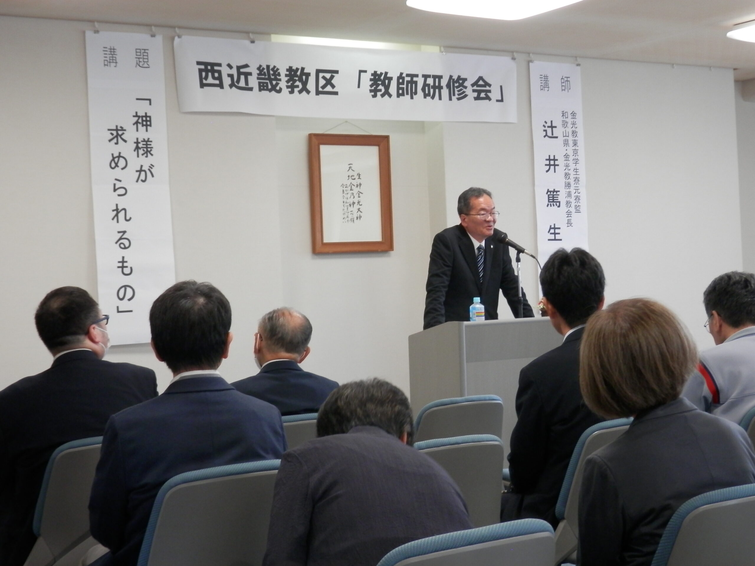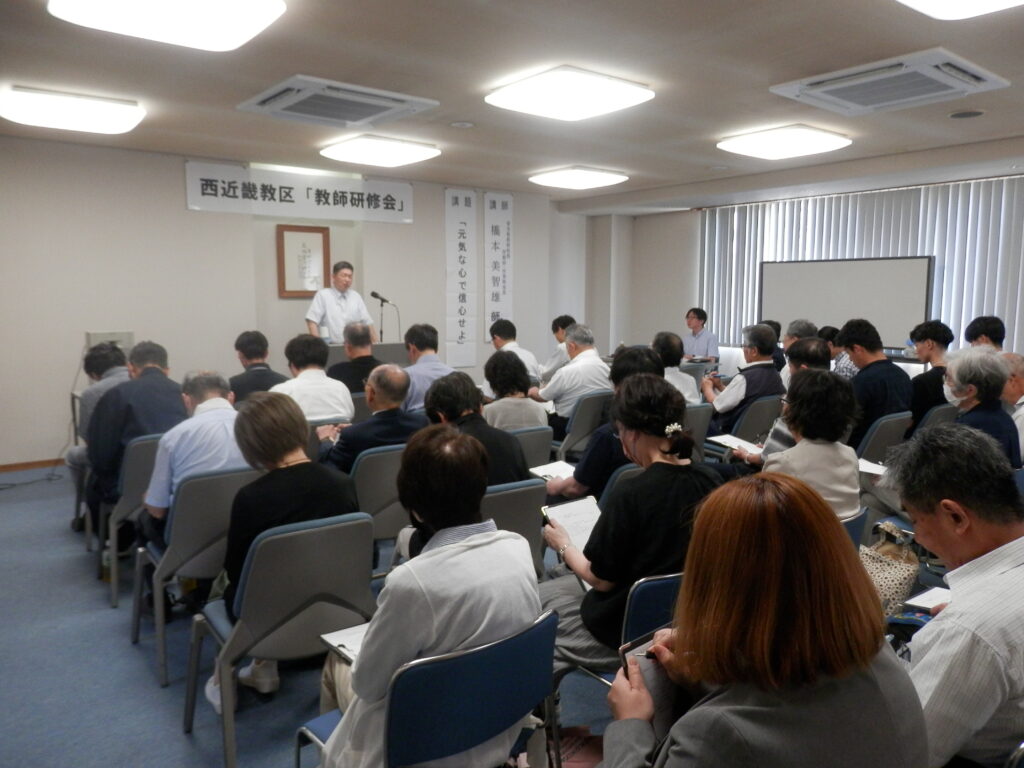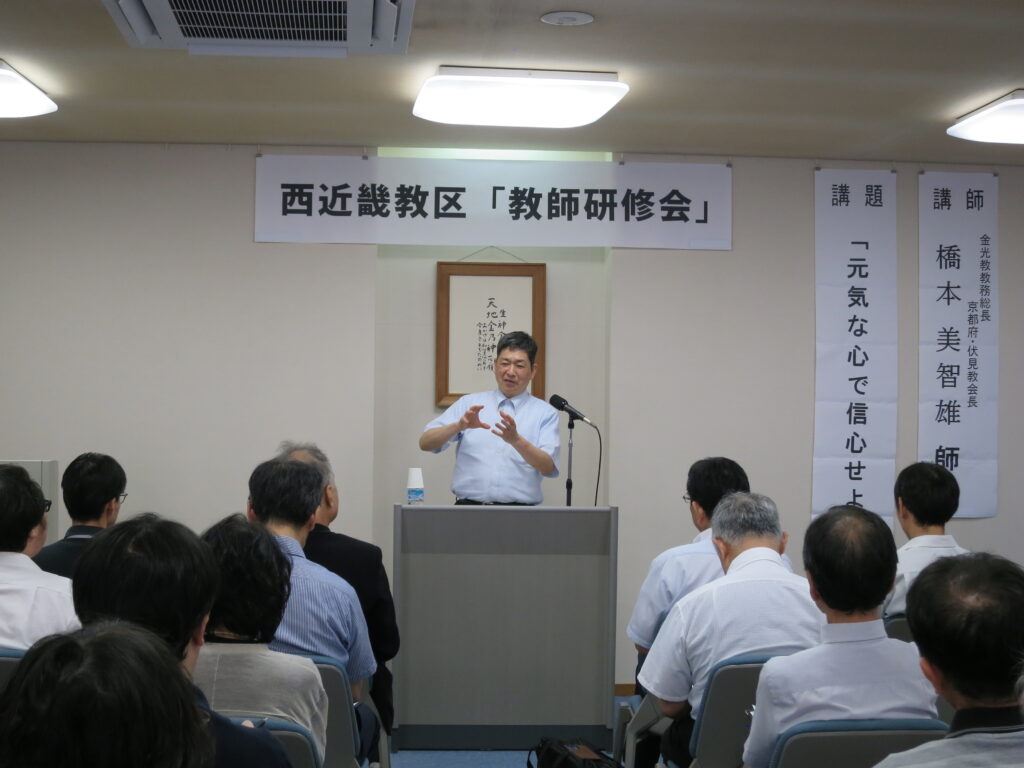 2025年6月19日(木)、西近畿教務センターを会場に、「教祖様の信心に自身の信心を重ねることで見えてくるものをもって、神様から願われている教師としての使命と役割を再確認し、ここからの信心の手がかりを得る」との願いのもと、教区「教師研修会」を開催しました。43人の教師が参加し、信心の研鑽に努めました。