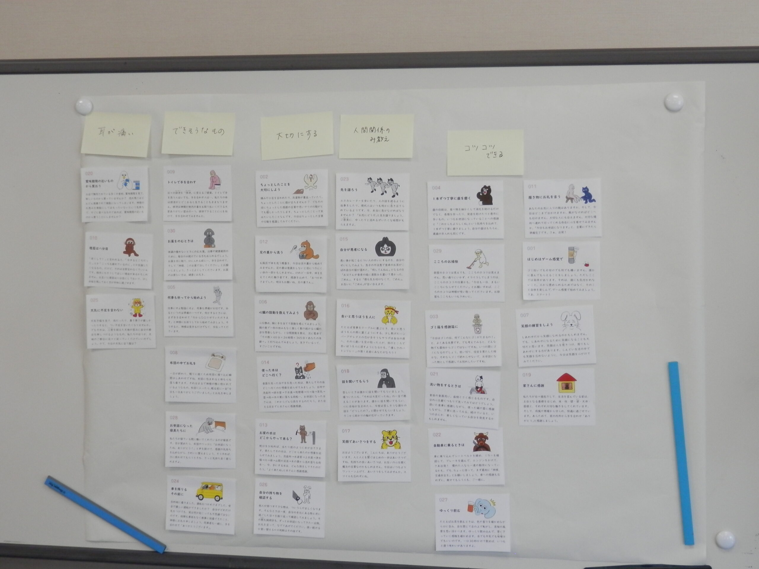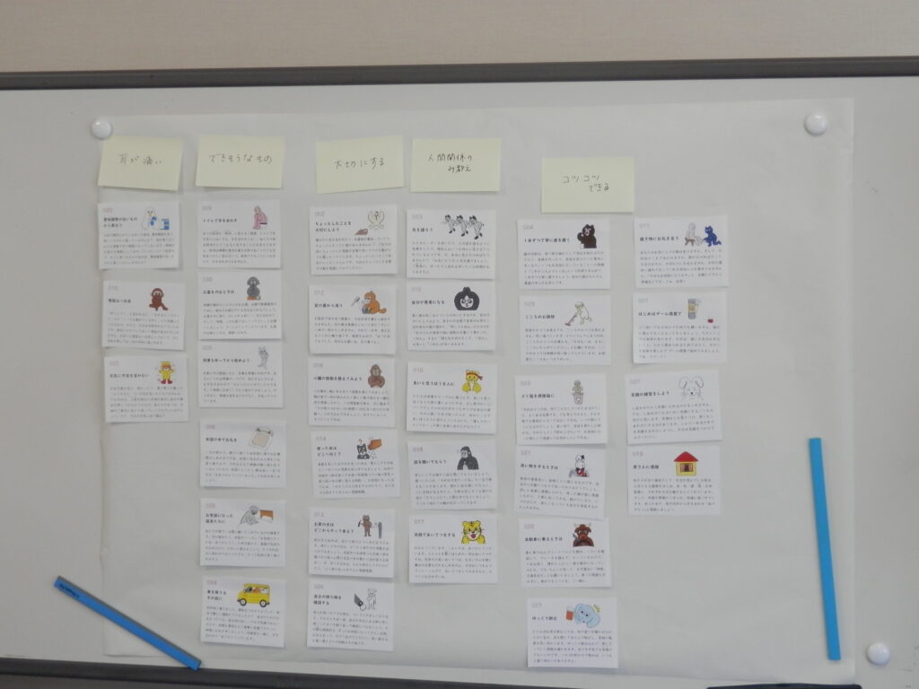 ワークショップでは、実践項目の中から抜粋した文言をカードにし、各班ごとにカードの内容に沿って自由にグループ分けをしました。各班からは「こころのお掃除」「お礼と感謝」など、それぞれ特色のあるグループ分けがなされました。その後、各班の代表者が、グループ分けをする過程や、特に気になった実践項目などについて発表をし、参加者全体で共有しました。発表の後は、センター職員より、『こころの練習帳』を用いた自身の教会での取り組みを紹介しました。